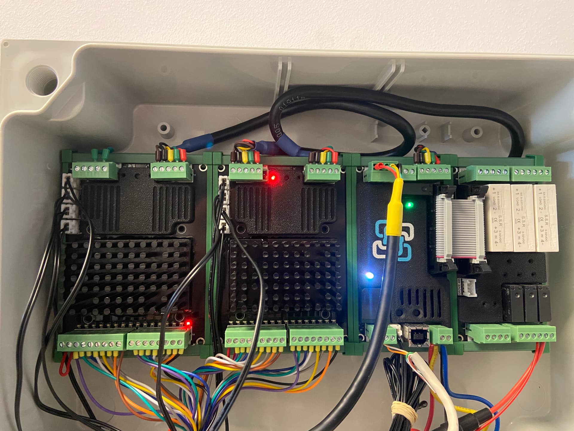 In this first photograph you can see the system turned on with the error of the second K9 (the one on the left of the photo), If I stop feeding the BMS (I have even disconnected the cable that connects it to the first K9), the red LED continues to be on.